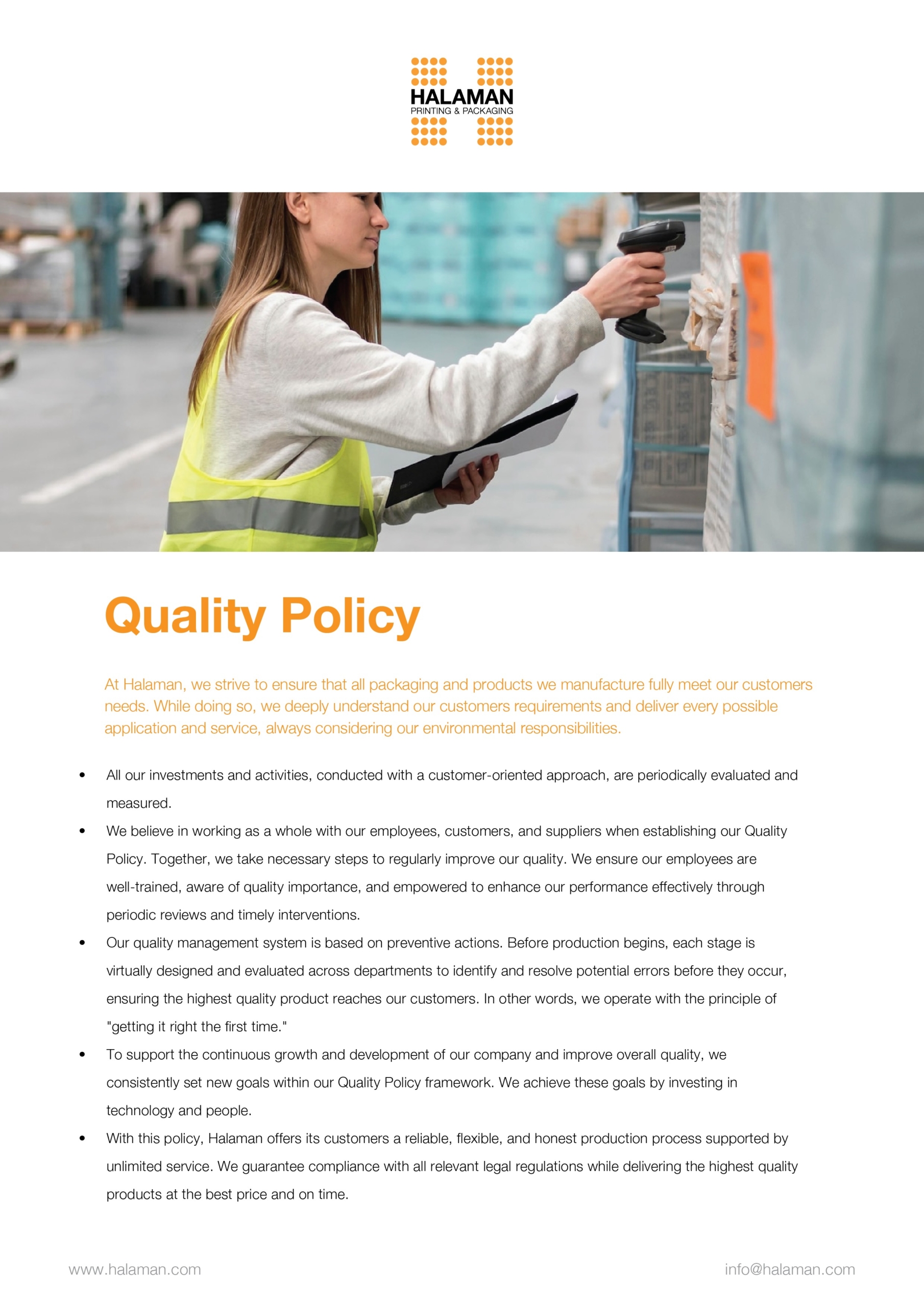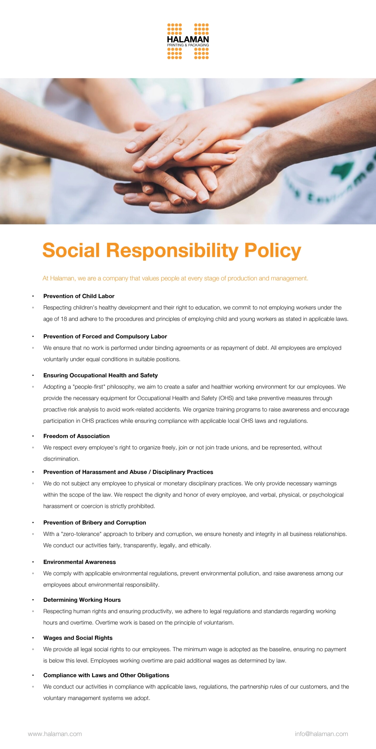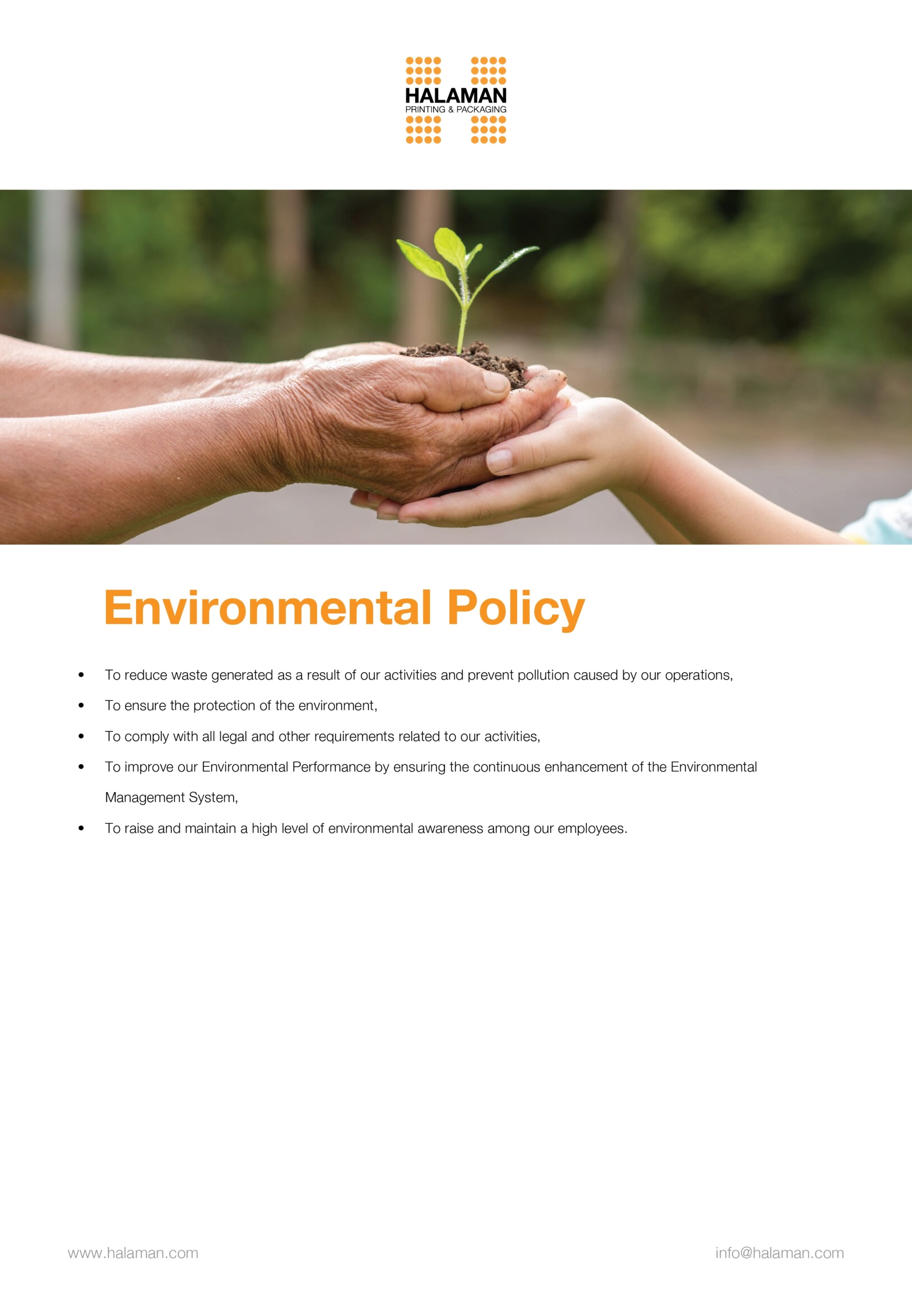 At Halaman Printing and Packaging, our policies reflect our unwavering commitment to sustainability, quality, safety, and ethical standards in every aspect of our operations. These policies guide us in achieving excellence and ensuring we operate with integrity while meeting the highest international standards.