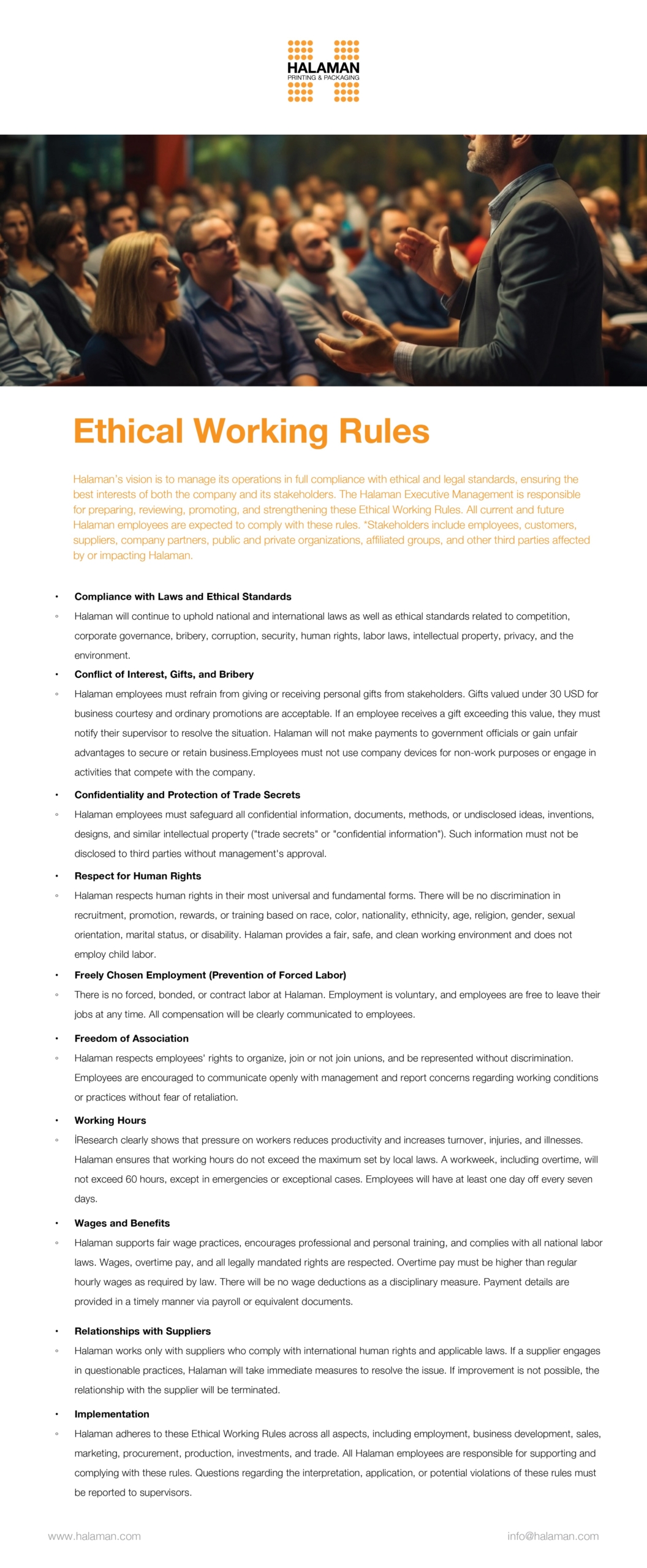 At Halaman, we believe in fair and ethical business practices. Our Ethical Working Rules define the standards of conduct for our team, emphasizing respect, transparency, and equality in the workplace.